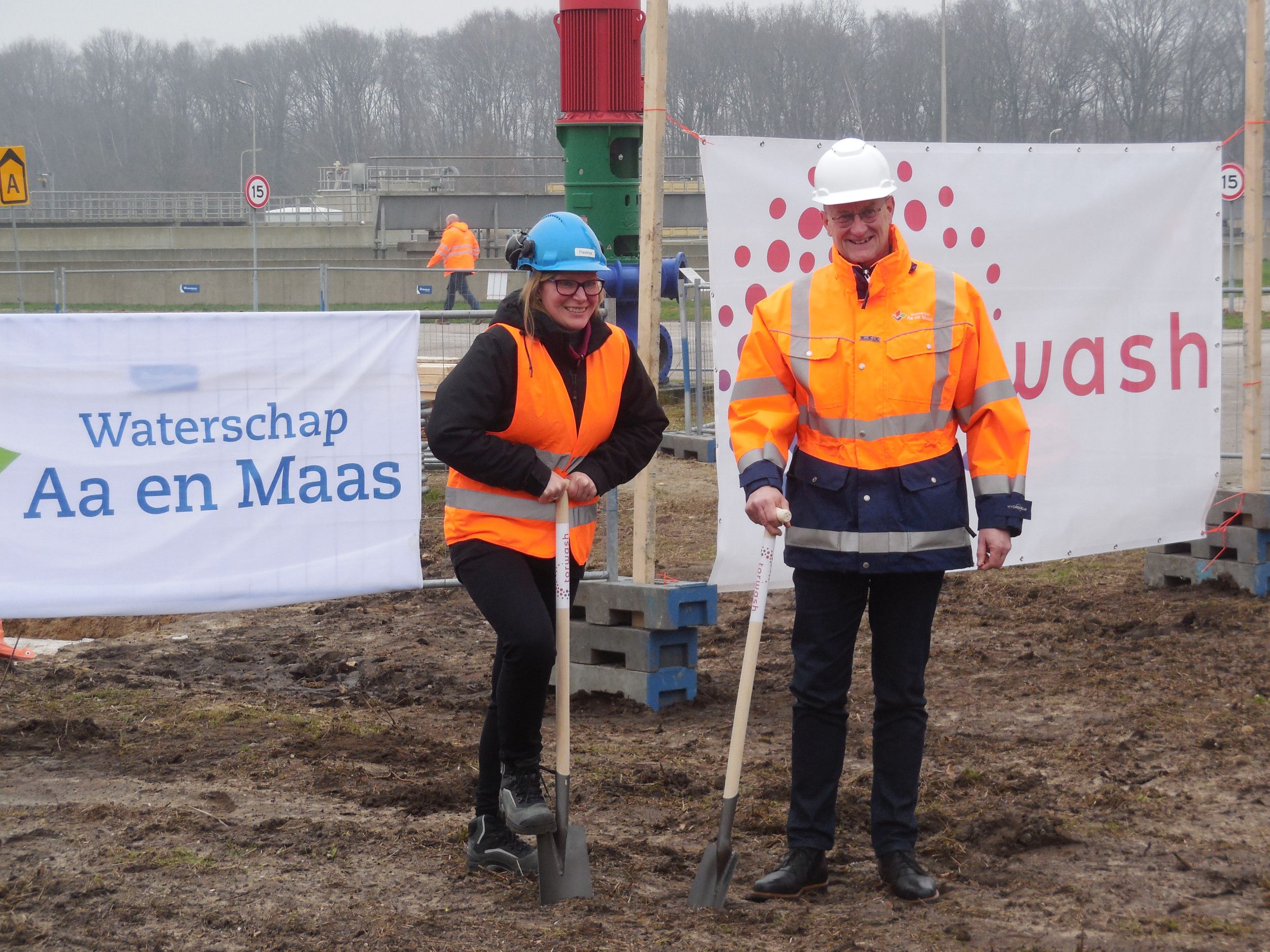 Last January 25, Pavlina Nanou (TORWASH b.v.) and Paul Bos (Waterschap Aa en Maas) fired the starting shot for the construction of the TORWASH demonstration plant at the RWZI Land van Cuijk by symbolically digging the first hole for the foundation. The company Eliquo is responsible for further activities for the erection of this innovative plant that can process about 500 liters of sludge per hour, equivalent to 10% of all sludge formed at the RWZI. -- Construction is expected to be completed during the summer months, after which TORWASH B.V. and TNO will take over to carry out the experimental phase. This phase will last until mid-2024 and will mainly consist of endurance tests based on different types of sludge.